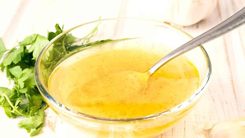 - In einer Schüssel Essig, Wasser und Senf mit einem Schneebesen mischen. Unter kräftigem Rühren das Öl hinzufügen, bis der Senf sich vollständig aufgelöst hat.