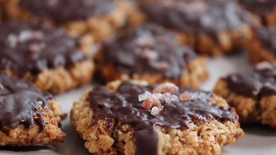 Mit einem Pinsel die Schokolade auf den Keksen verstreichen. Optional mit Salz beträufeln.