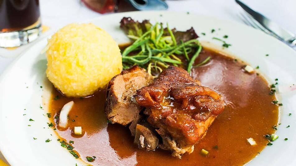 - Die Keule portionsweise auf Tellern anrichten, mit der Soße und ein paar Klößen servieren.