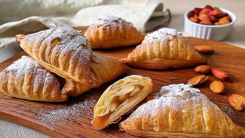 - Rolle den gekühlten Teig auf einer leicht bemehlten Arbeitsfläche erneut zu einem Rechteck aus und schneide ihn mit einem Teigrad in 12 gleich große Rechtecke. Bestreiche die Ränder mit verquirltem Eiweiß.
