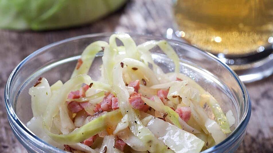 - Die Marinade mit dem Weißkohl vermengen. Das Ganze für zwei Stunden ziehen lassen. Mit Salz und Pfeffer abschmecken.