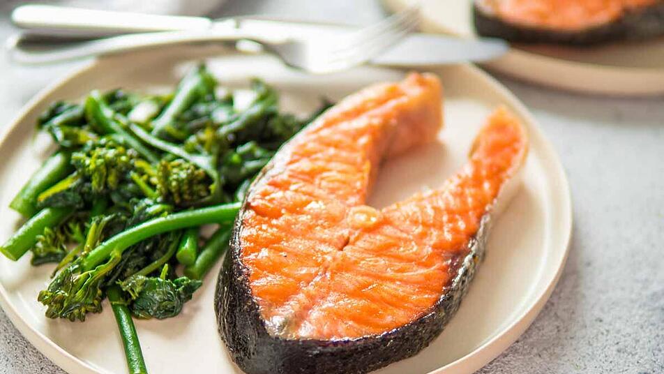 - Etwas Öl oder Butter in einer Pfanne erhitzen und die Lachssteaks darin von beiden Seiten jeweils ca. 5 Minuten braten. Anschließend aus der Pfanne nehmen und die Zwiebeln hineingeben und andünsten. Das Gemüse hinzugeben und anbraten. Mit der Gemüsebrühe ablöschen und kurz garen. Zuletzt die Steaks wieder hinzugeben und mit Thymian bestreuen.