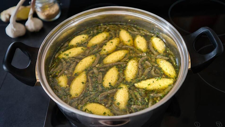 - Eine klare Brühe erhitzen, die Leberspätzle und die Nockerl dazugeben und kurz aufkochen lassen. Die Suppe anrichten und mit fein gehackter Petersilie garnieren.