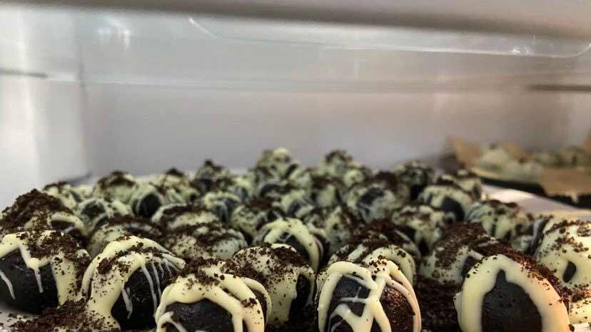 - Die Oreo-Brösel mit dem Frischkäse vermischen bis eine einheitliche Masse entsteht. Anschließend aus der Oreo-Frischkäse-Masse kleine Kugeln formen und auf ein Backpapier oder Kuchengitter legen. Nun in den Kühlschrank geben und kalt werden lassen.