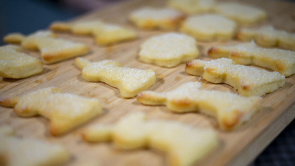 - Mit Ausstechformen Figuren ausstechen und auf die Backbleche verteilen. Mit etwas flüssiger Butter bestreichen.