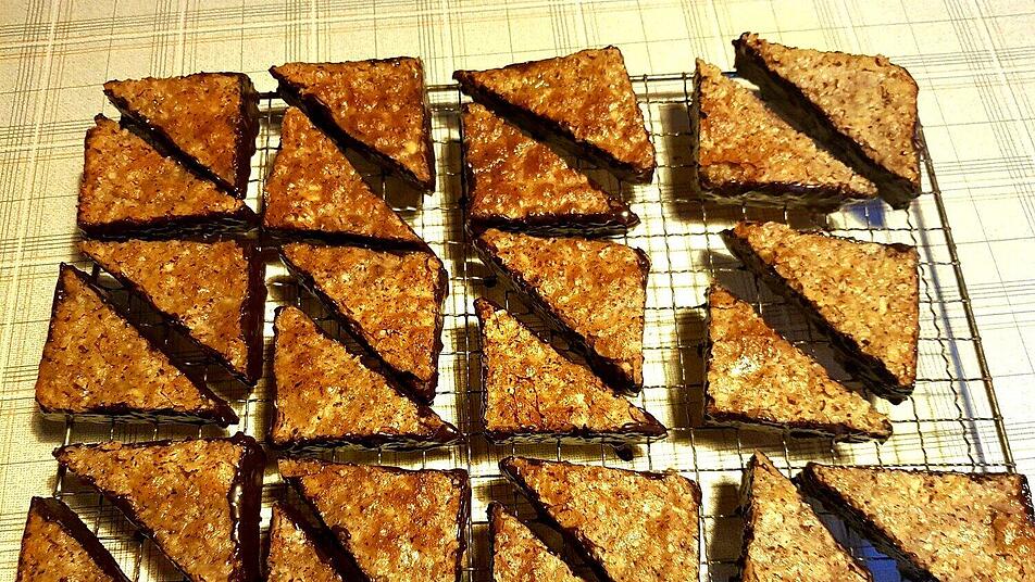 - Zum Schluss die Kanten der erkalteten Nussecken mit Schokoladenglasur bestreichen.