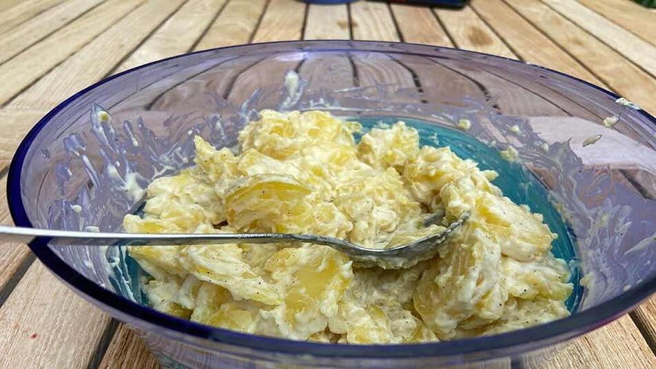 - Die Kartoffelscheiben in die Salatschüssel geben und nach Belieben würzen. Außerdem die Mayonnaise hinzugeben und alles gut miteinander vermengen. Am besten erst kurz vorm Verzehr die Mayo hinzugeben, ansonsten im Kühlschrank aufbewahren.