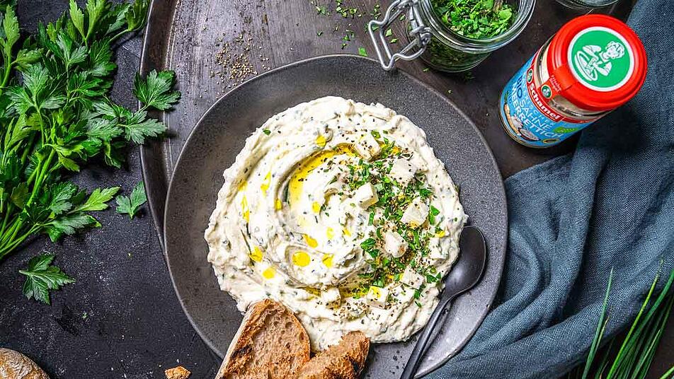 - Die Kräuter mit Frisch- und Schafskäse glatt rühren und mit Olivenöl, Pfeffer und Bio Sahne Meerrettich abschmecken.