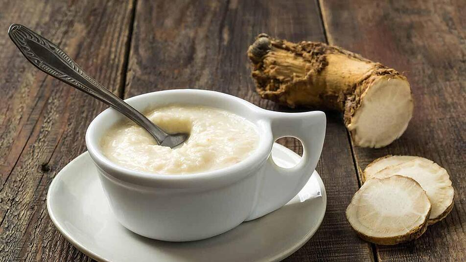 - Nun den Meerrettich putzen und mit einer Küchenreibe fein reiben. Drei Esslöffel der geriebenen Meerrettich-Masse nehmen und zur Soße geben.