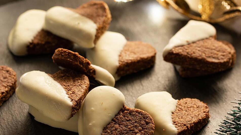 - Nach dem Abkühlen werden die Herzen mit geschmolzener Kuvertüre überzogen – entweder ganz oder zur Hälfte, je nach Geschmack. Nach dem Trocknen sind sie bereit zum Genießen.