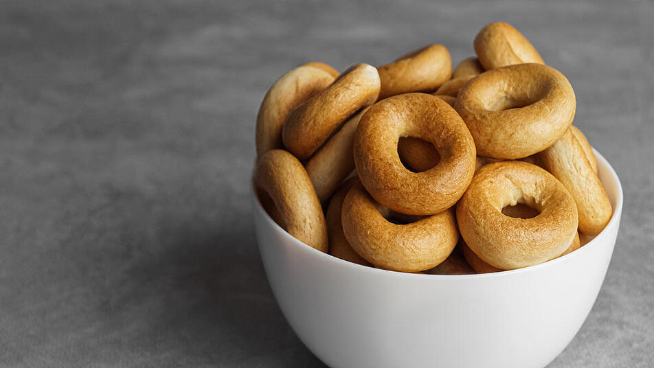 - Ist die Ruhezeit vorbei, kannst du den Teig zu einer Rolle formen. Von dieser schneidest du gleich große Stücke ab, aus denen du im Anschluss die Ringe formst.