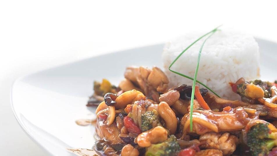 - Die restlichen Nüsse zusammen mit der sauren Sahne fein pürieren. Die entstandene Soße mit in den Topf zu den restlichen Zutaten geben. Alles mit Salz, Pfeffer und Currypulver abschmecken und servieren!