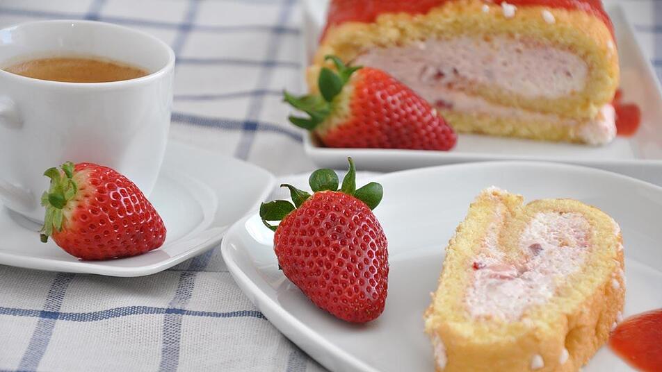 - Jetzt wird die Rolle befüllt: Dafür rollt man die Biskuitplatte auf und verteilt die Creme darauf. Oben einen Rand von ca. 3 cm frei lassen. Die Erdbeerstückchen auf der Creme verteilen und die Rolle mit Hilfe eines Geschirrtuchs vorsichtig einrollen.