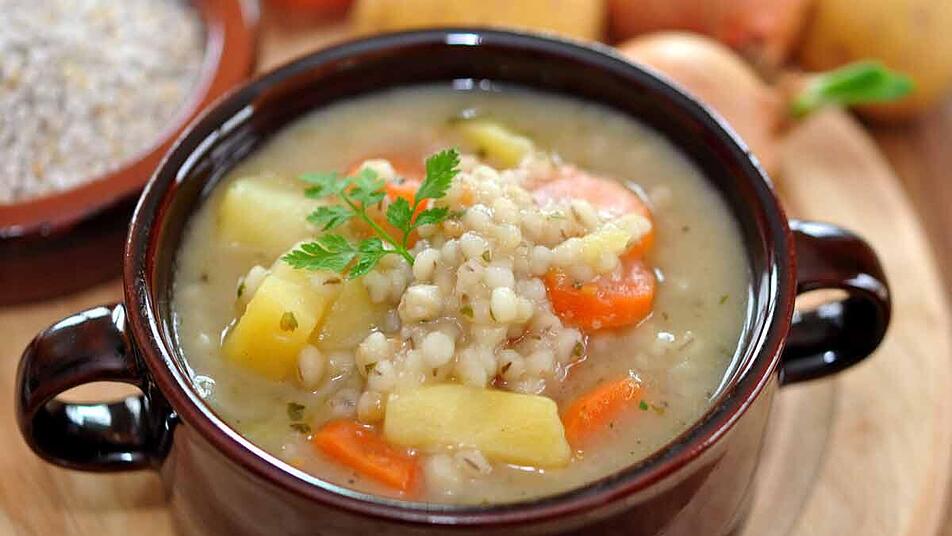 - Mit der Fleischbrühe ablöschen und bei kleiner Hitze für 15-20 Minuten kochen lassen, bis das Gemüse weich ist. Die letzten Minuten die Perlgraupen hinzugeben.