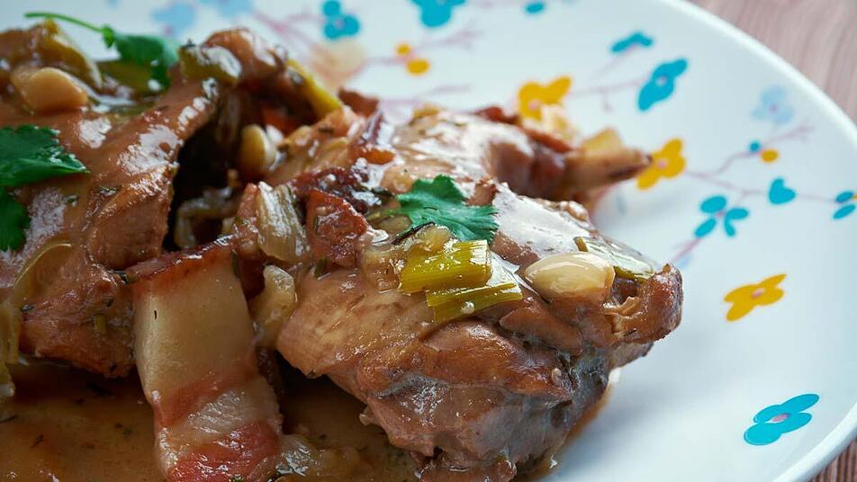 - Anschließend den Topf vom Herd nehmen und das Hasenblut und die abgegossene Soße dazugeben. Mit Zucker und Essig abschmecken. Danach den Hasen in die Soße legen und durchziehen lassen.