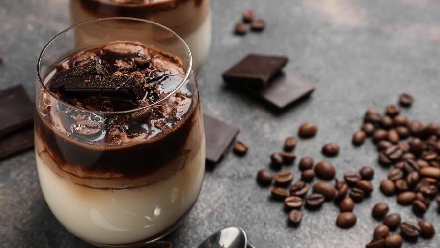 - Für die Kaffee-Schoko-Sauce die Schokolade im Wasserbad schmelzen. Den frisch aufgebrühten Espresso zur geschmolzenen Schokolade geben und gut verrühren. Die Panna Cotta aus dem Kühlschrank nehmen und die Schoko-Kaffee-Masse auf die Gläser verteilen.