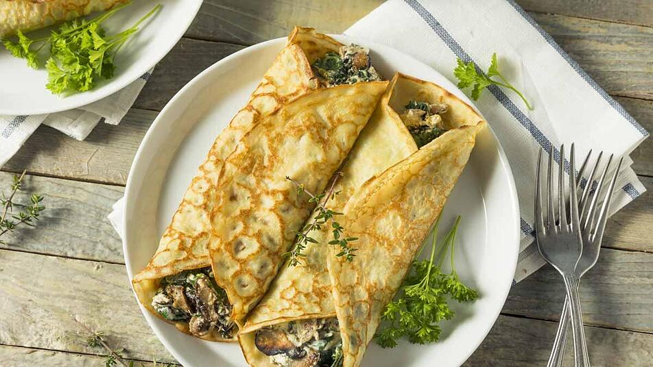 - Schließlich die Pfannkuchen mit der Spinat-Pilz-Mischung füllen und genießen.