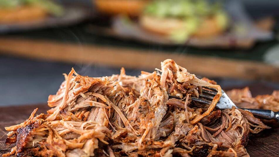 - Nach der Ruhezeit haben wir eigentlich alles richtig gemacht und der Braten sollte butterzart sein. Jetzt können wir ihn mit zwei Gabeln oder einfach mit den Händen zerpflücken. Am besten geht das mit sogenannten Fleischkrallen! Das Fleisch großzügig mit der BBQ-Sauce und dem ausgetretenen Bratensaft vermischen.