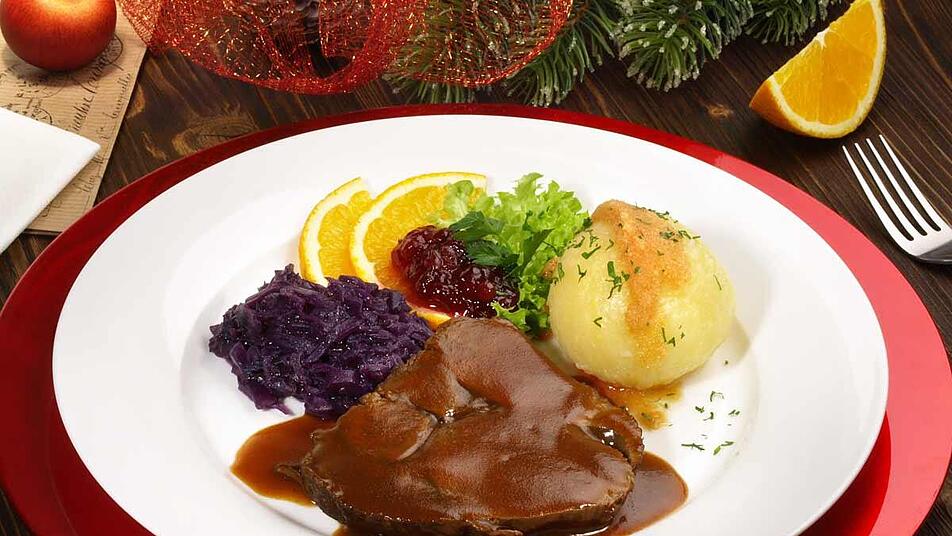 - Sobald die Flüssigkeit kocht, kannst du sie mit Soßenbinder eindicken. Gib dann Rotwein, Fleischbrühe, die Gewürze und je nach Belieben noch etwas Wildgewürz dazu. Lasse dann alles für circa 1,5 Stunden köcheln.
