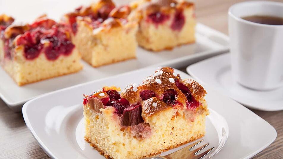 - Den Zucker zusammen mit der Butter schaumig schlagen, dann nach und nach die Eier dazugeben. Das Mehl zusammen mit dem Backpulver unter den Teig heben. Die Masse auf ein hohes Backblech, das mit Backpapier ausgelegt wurde, streichen. Dann die Kirschen und den Rhabarber darüber verteilen.