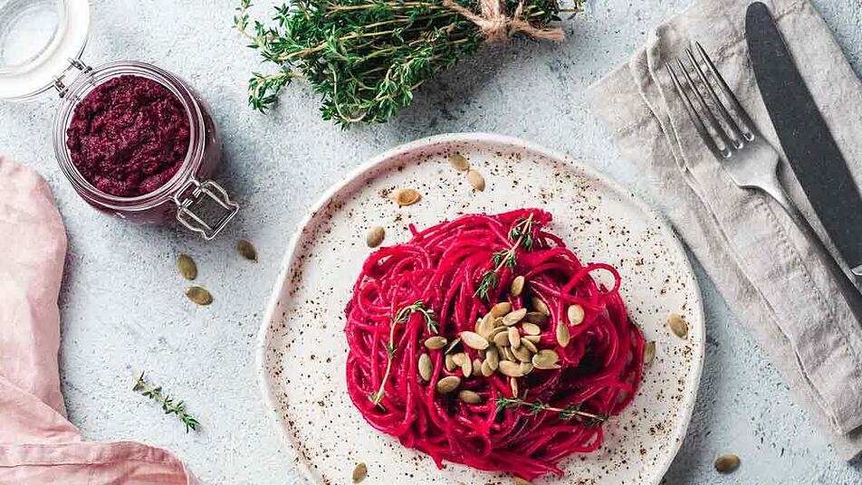 - Bevor die die Rote Beete abgegossen wird, 120 ml des Kochwassers abschöpfen (Dafür kein Holz und Kunststoff verwenden, da sich diese verfärben können!). Dann die Rote Beete abseihen und zusammen mit Kochwasser, gerösteten Walnüssen, Basilikum, Knoblauch, Olivenöl, Salz und Pfeffer in einen Mixer geben. Alles zu einer feinen cremigen Masse pürieren.