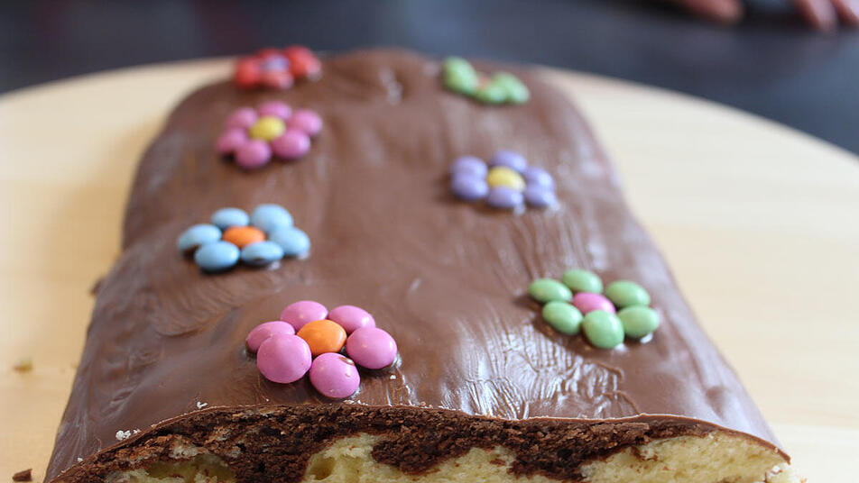 - Vollmilch Kuvertüre schmelzen und auf dem Kuchen verstreichen und anschließend je nach Geschmack verzieren.