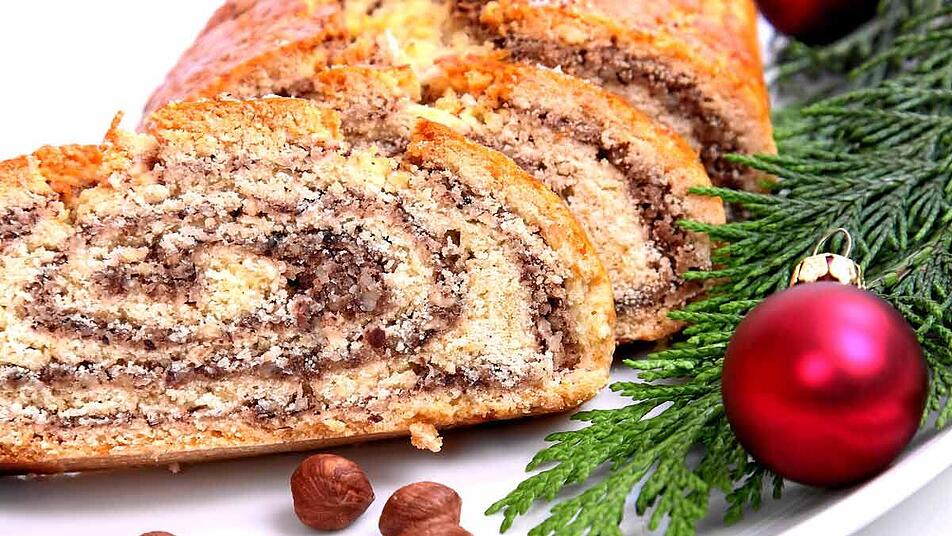 - Den Teig nach dem Gehen auf einer bemehlten Fläche zu einem Rechteck (ca. 30 x 40 cm) ausrollen. Die Nussfüllung gleichmäßig auf dem Teig verteilen, dabei einen kleinen Rand frei lassen. Den Teig von der Längsseite her aufrollen und vorsichtig zu einem Stollen formen.