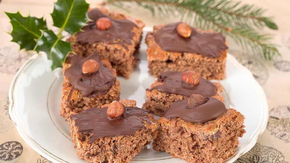 - Anschließend eine Schokoladenglasur auf den noch warmen Teig streichen. Nachdem alles etwas abgekühlt ist kann der Teig in kleine Streifen oder Rauten geschnitten werden.