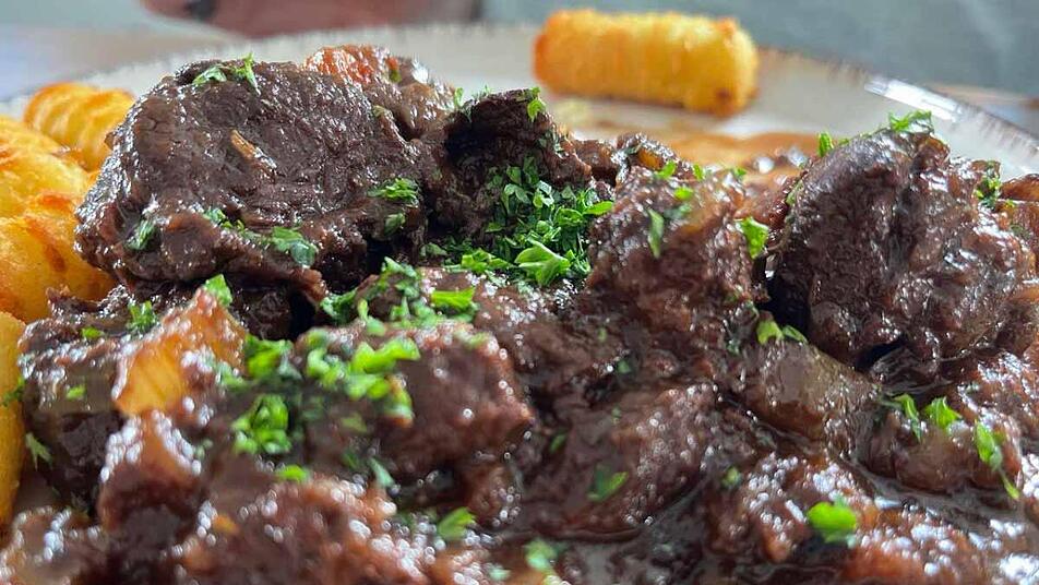 - Anschließend das Gulasch mit dem Rotwein ablöschen und einkochen.