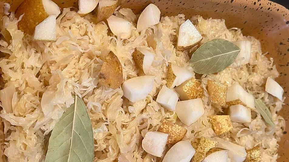 - Die Birnen entkernen und in Scheiben schneiden, danach zum Kraut geben und vermischen.