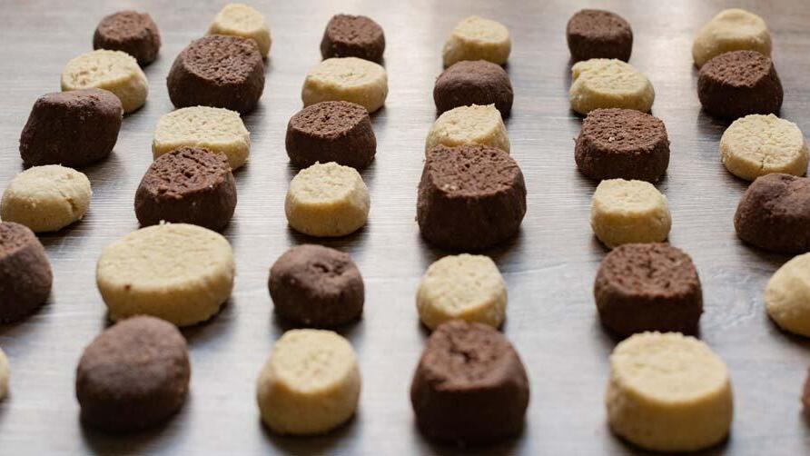 - Schmalz, Butter, Zucker und Vanillezucker in einer Schüssel cremig schlagen, bis die Masse schön schaumig ist. Mehl und Backpulver miteinander vermengen und unter den Teig kneten. Den Teig in zwei gleiche Portionen teilen. Eine Hälfte mit Kakao verkneten, sodass zwei unterschiedlich gefärbte Teige entstehen.