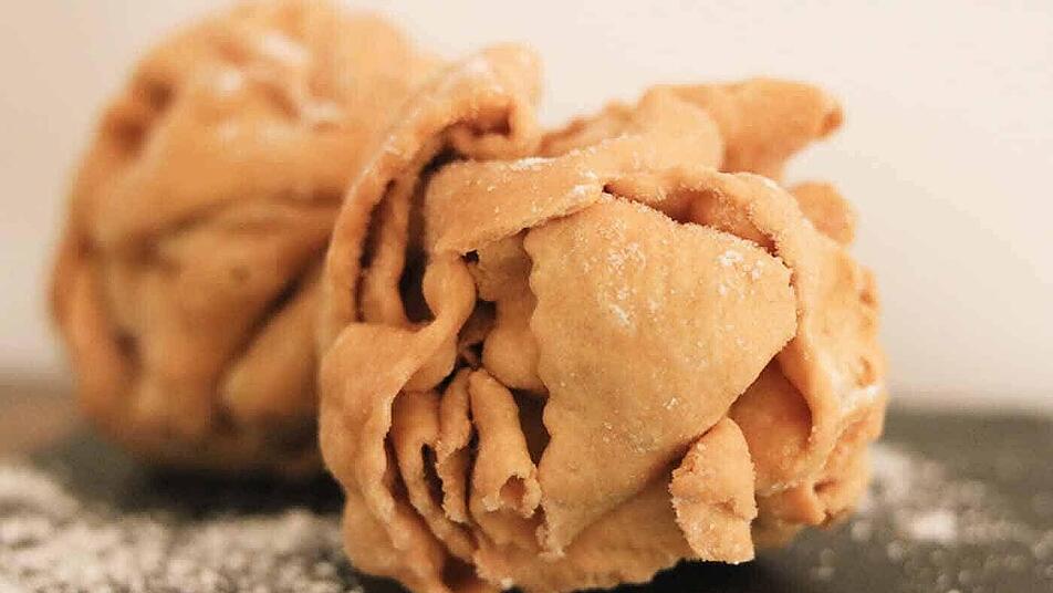 - Mit einem Holzlöffel jeden zweiten Streifen aufnehmen, wie man es beim Weben kennt. Den Löffel anheben, dabei mit der freien Hand locker den Teig von unten festhalten. Mit dem Kochlöffel direkt über dem heißen Öl in den Topf oder die Friteuse abstreifen. Sofort mit zwei Gabeln den Schneeballen für 1-2 Minten unter Wenden und Drehen den Schneeballen zu einem runden Ball zusammenhalten. Alternativ kann man auch ein Schneeballeneisen verwenden.