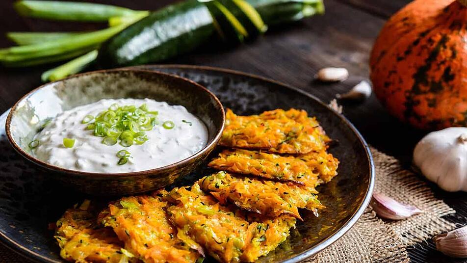 - Öl in einer beschichteten Pfanne erhitzen. Aus ca. 2 EL Masse Gemüsepuffer formen und in der Pfanne flachdrücken. Von beiden Seiten anbraten, bis sie goldbraun sind. Die fertigen Puffer dann auf ein Küchentuch legen, um das überschüssige Öl zu entfernen. Die Puffer mit etwas Kräuterquark servieren.