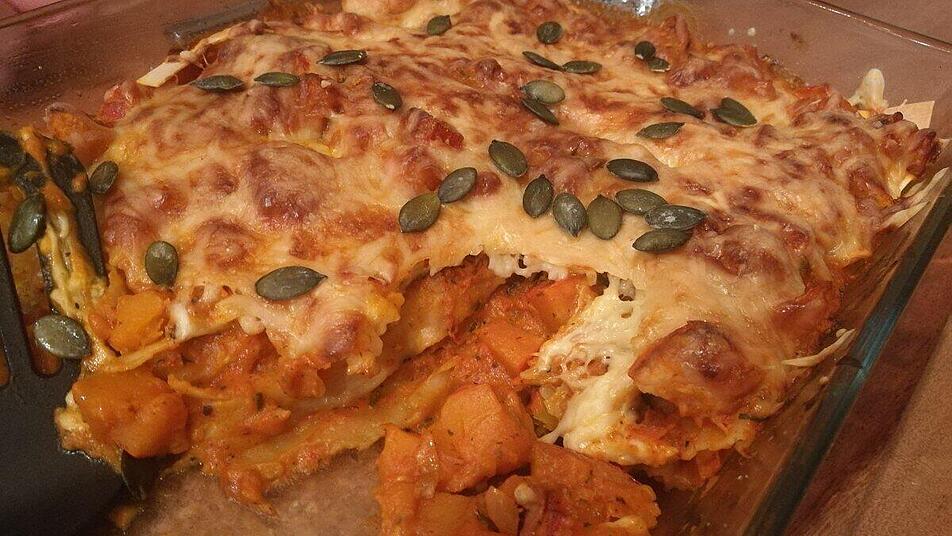 - Zuletzt etwas Streukäse auf die Lasagne geben und für etwa 35 Minuten bei 180° Ober-/Unterhitze im Ofen backen. Etwa 5 Minuten vor Ende die Lasagne mit Kürbiskernen bestreuen. Wenn der Käse leicht braun wird, ist die Lasagne perfekt.