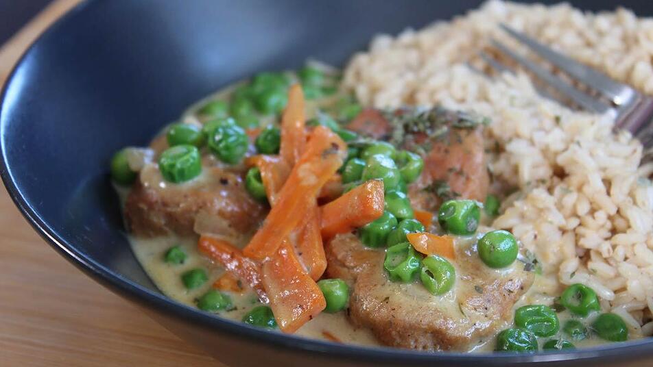 - Als Letztes die Erbsen in die Pfanne geben und erwärmen. Die Soße abschmecken und nach Bedarf etwas nachwürzen. Mit frischer, gehackter Petersilie bestreuen und am besten mit Reis servieren.
