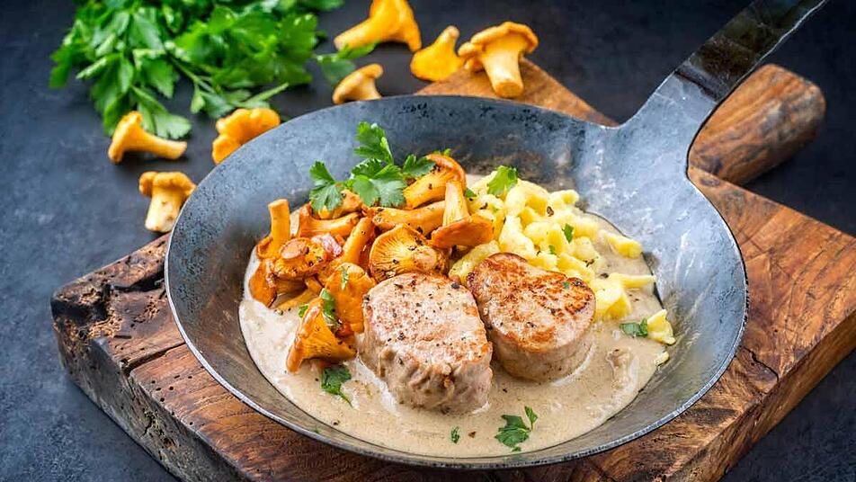 - Die Pilze und die Zwiebel mit der Sahne ablöschen. Mit Salz und Pfeffer würzen. Zum Schluss das Fleisch wieder mit in die Pfanne geben, nochmals erwärmen und die Petersilie unterheben. Dazu passen Spätzle.