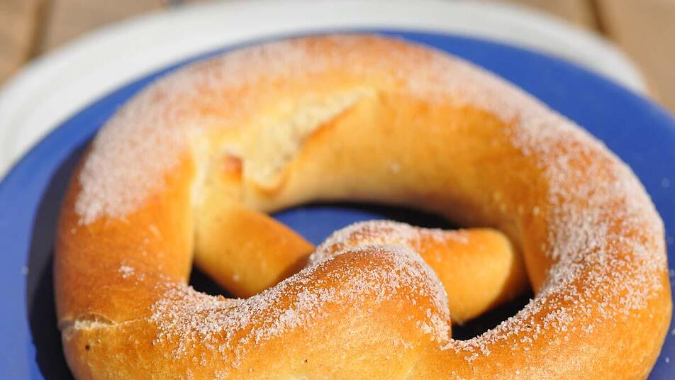 - Den Teig in 8 gleich große Portionen teilen. Jede Portion zu einem langen Strang rollen und daraus Brezeln formen.