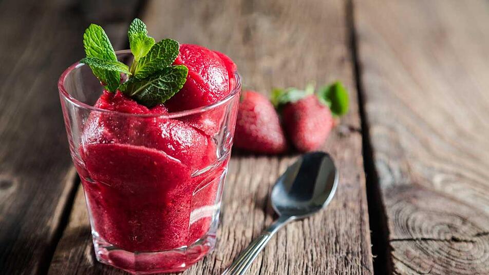 - Die Erdbeermasse in eine flache, gefrierfeste Form füllen. In den Gefrierschrank stellen und ca. 3-4 Stunden gefrieren lassen. Alle 30 Minuten umrühren, damit die Masse gleichmäßig wird und sich keine Eiskristalle bilden. Wer einen Mixer hat, kann die Masse auch durchfrieren lassen und anschließend im Mixer fein pürieren.