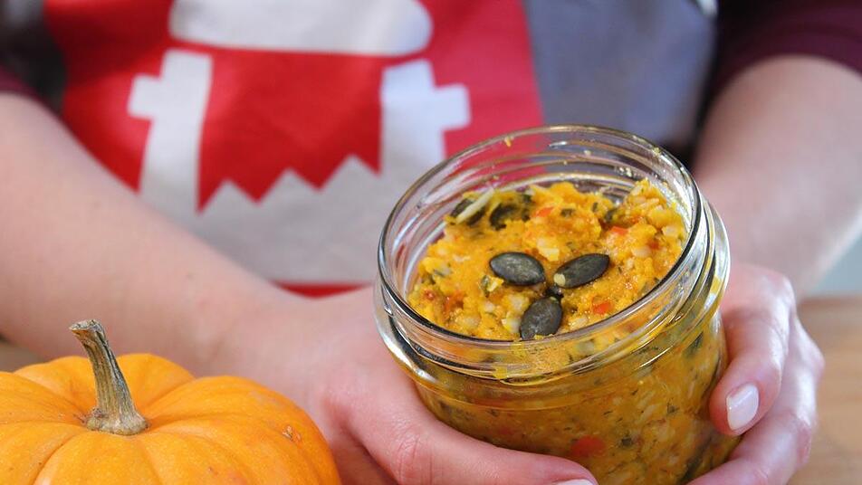 - Ist der Kürbis durch, nehmen wir ihn aus dem Ofen und lassen ihn etwas abkühlen. Dann wird er gemeinsam mit den anderen Zutaten, also mit den Kürbiskernen, dem Öl, den gepressten Knoblauch und den Gewürzen mithilfe einer Küchenmaschine zerkleinert. Wie fein ihr dabei die Pesto-Masse haben möchtet, ist euch überlassen.
