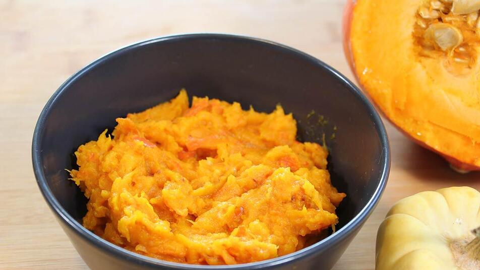 - Die gerösteten Kürbiswürfel in einen Topf oder eine Schüssel geben und mit einem Stabmixer oder einem Kartoffelstampfer zu einem Püree verarbeiten. Eventuell noch nachwürzen.