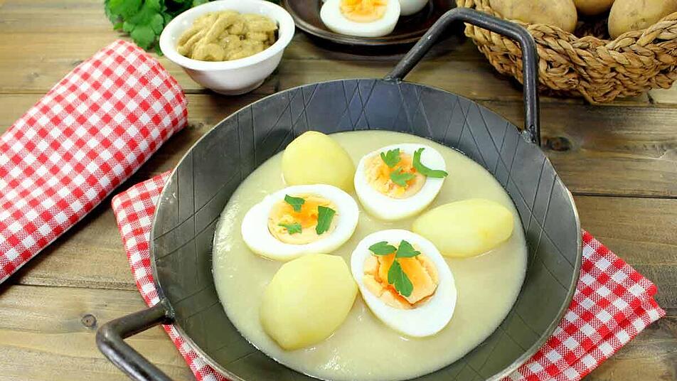 - Die Eier schälen, halbieren und in die Sauce geben. Das Ganze mit Deckel ziehen lassen, bis die Kartoffeln fertig sind und anschließend gemeinsam servieren. Zum Garnieren noch etwas Petersilie oder Schnittlauch drüber und fertig. Guten Appetit!