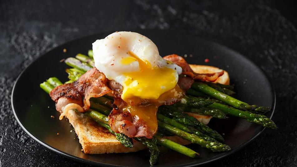 - Währenddessen die Toastscheiben Toasten. Dann den Spargel und jeweils zwei Streifen Schinken daraufgeben.