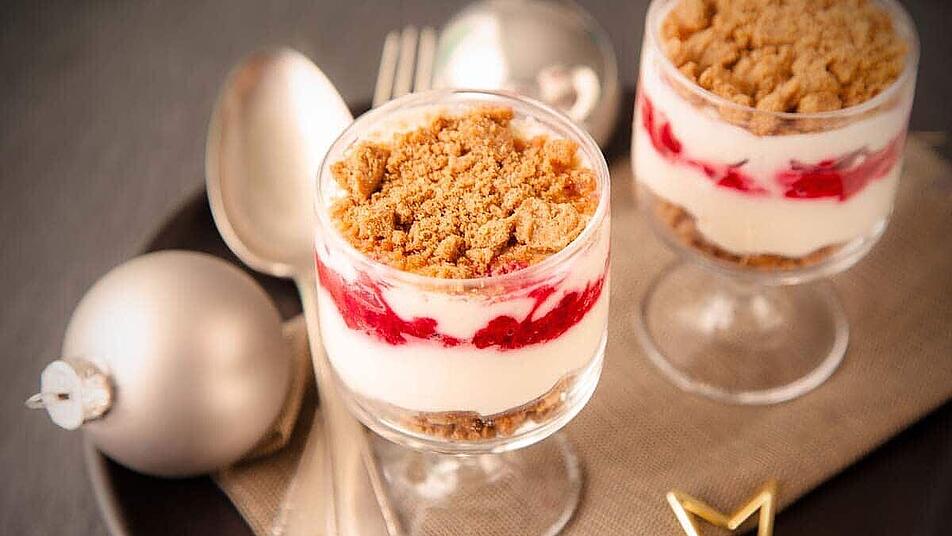 - Die Dessertgläser zunächst mit 2 EL Spekulatius-Bröseln befüllen, dann eine Schicht Creme (es sollte etwa die Hälfte der Masse übrig bleiben) darüber geben.