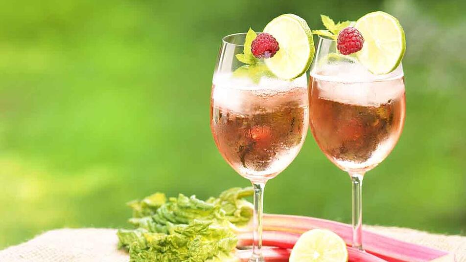 - Zum Garnieren einen Streifen Rhabarber oder eine Scheibe Limette und ein paar Blätter Minze in die Gläser geben.