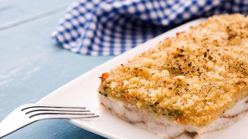 - Eine Auflaufform einfetten und mit einer Schicht des entgräteten Stockfischs beginnen. Diese Schicht leicht salzen und pfeffern. Darauf eine Schicht der Speck-Zwiebel-Brötchen-Mischung geben. Die Schichten abwechselnd wiederholen, bis alle Zutaten verbraucht sind. Die oberste Schicht sollte aus der Speck-Zwiebel-Brötchen-Mischung bestehen.