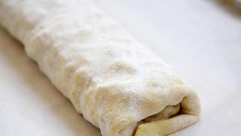 - Die beiden Teigrollen nacheinander auf einem gut bemehlten Tuch mit dem Nudelholz sehr dünn zu Rechtecken ausrollen. Wird der Teig nicht mehr größer, lass ihn für 3-4 Min. ruhen, dann lässt er sich weiter ausrollen.