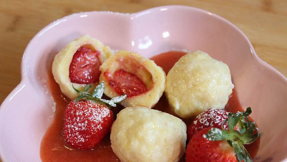 - Nun aus dem kalten Teig flache Fladen formen, eine Erdbeere in die Mitte geben und den Teig oben verschließen. Den gefüllten Kloß kurz zwischen den Händen rollen, sodass er schön rund wird.