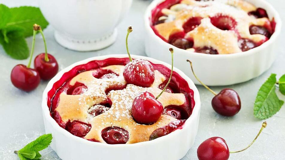 - Den Teig in die Auflaufform geben und die Kirschen darauf verteilen. Im vorgeheizten Backofen ca. 25 Min backen und am besten warm verzehren.