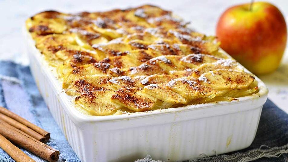 - Eine kleine Backform buttern. Abwechselnd Weckaa-Masse und Äpfel in die Form schlichten. Die restliche Butter in kleinen Flocken darauf verteilen und die Haselnüsse darüberstreuen.