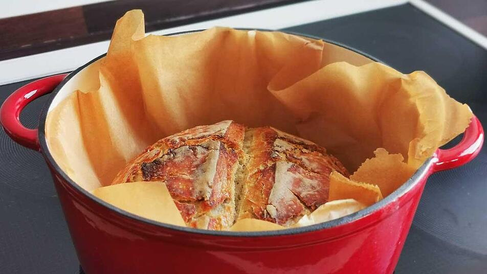 - Das Brot auf mittlerer Schiene, eine Stunde bei 250 Grad backen. Danach das Brot einige Minuten abkühlen lassen und schließlich aus dem Topf lösen.